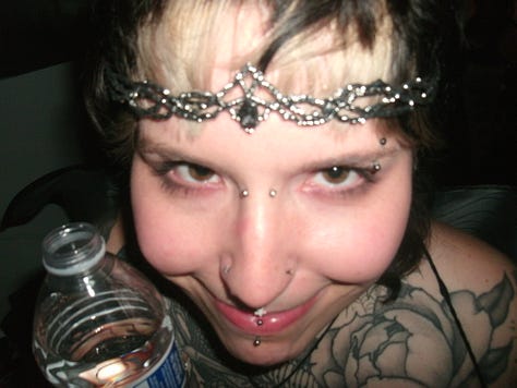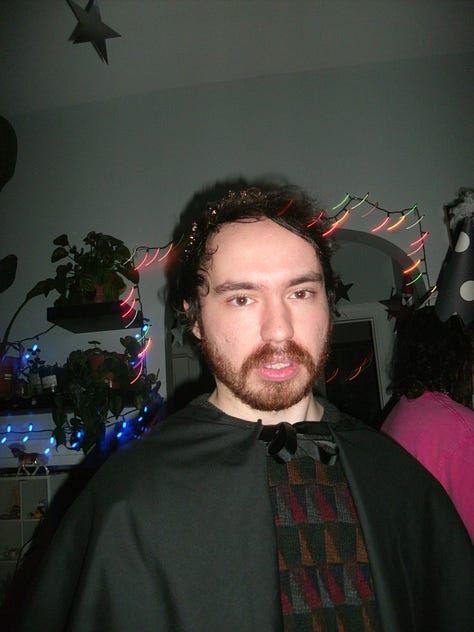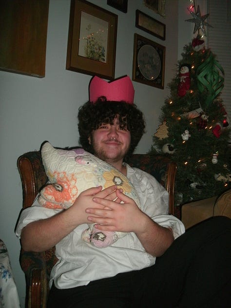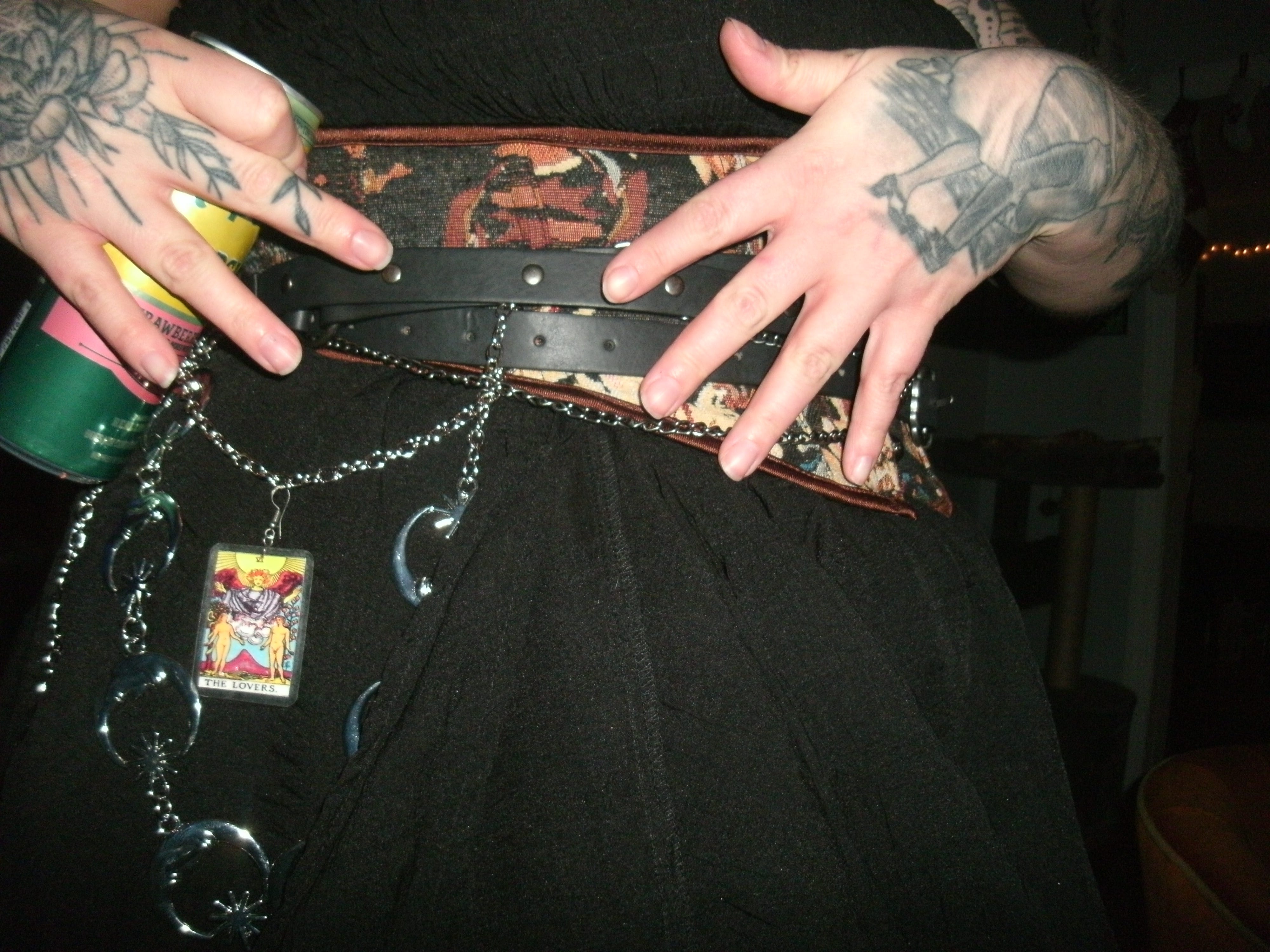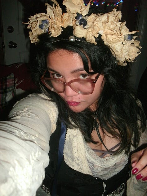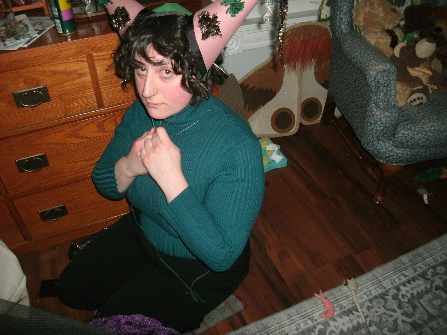 In a couple manic hours, I gathered up old poster board and fabric scraps, and hot glued together a pretty pink princess hat with little bows and buttons. It was passed around with the bottle of 16% XXL peach wine that had me giving drunken tarot readings on Faye’s bedroom floor.