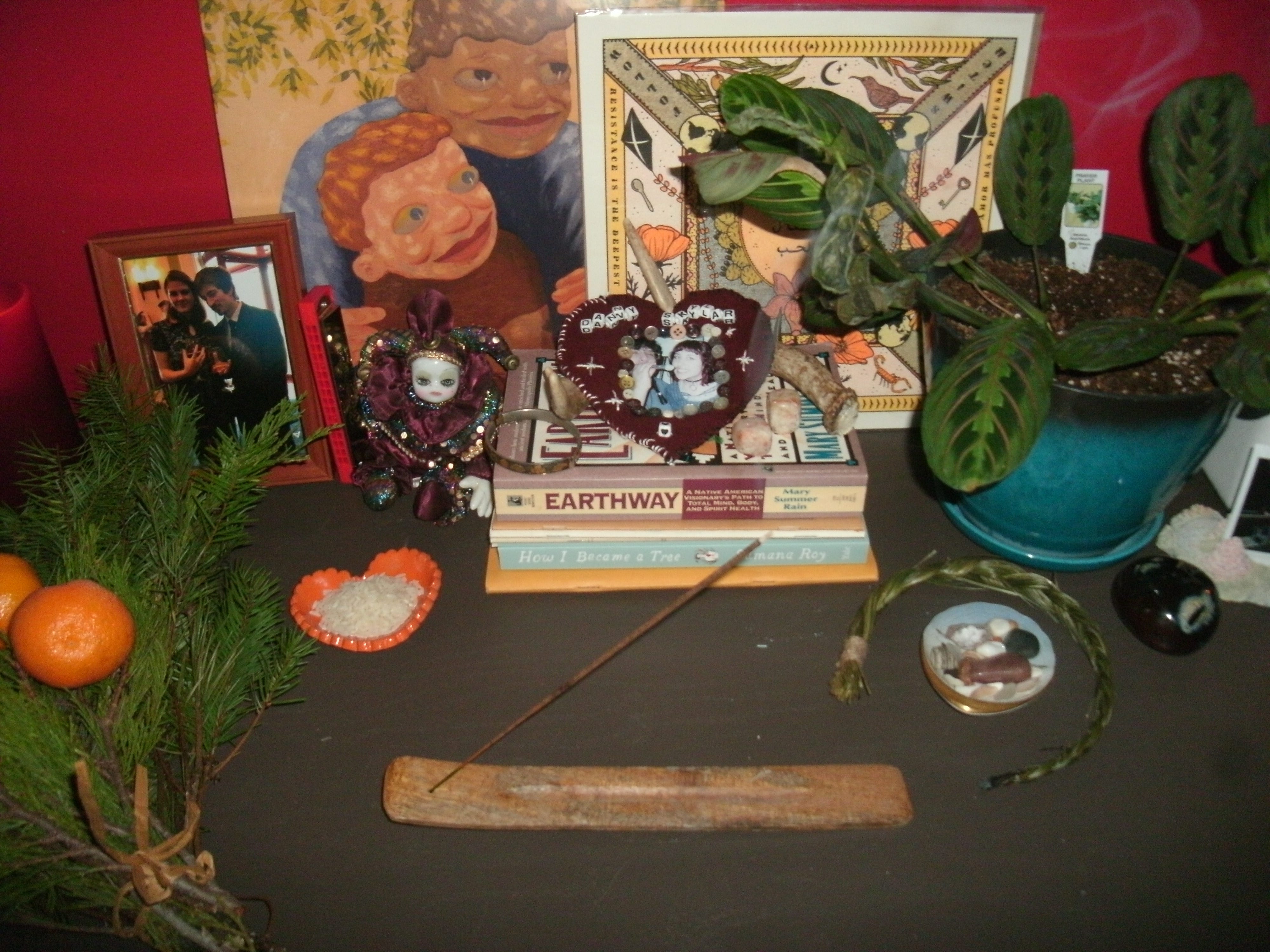 Pine and cedar for renewal, strength Clementines and rice for prosperity, abundance A Palestinian poem for peace Family jewelry for my ancestors A little jester toy for playfulness, for my inner child